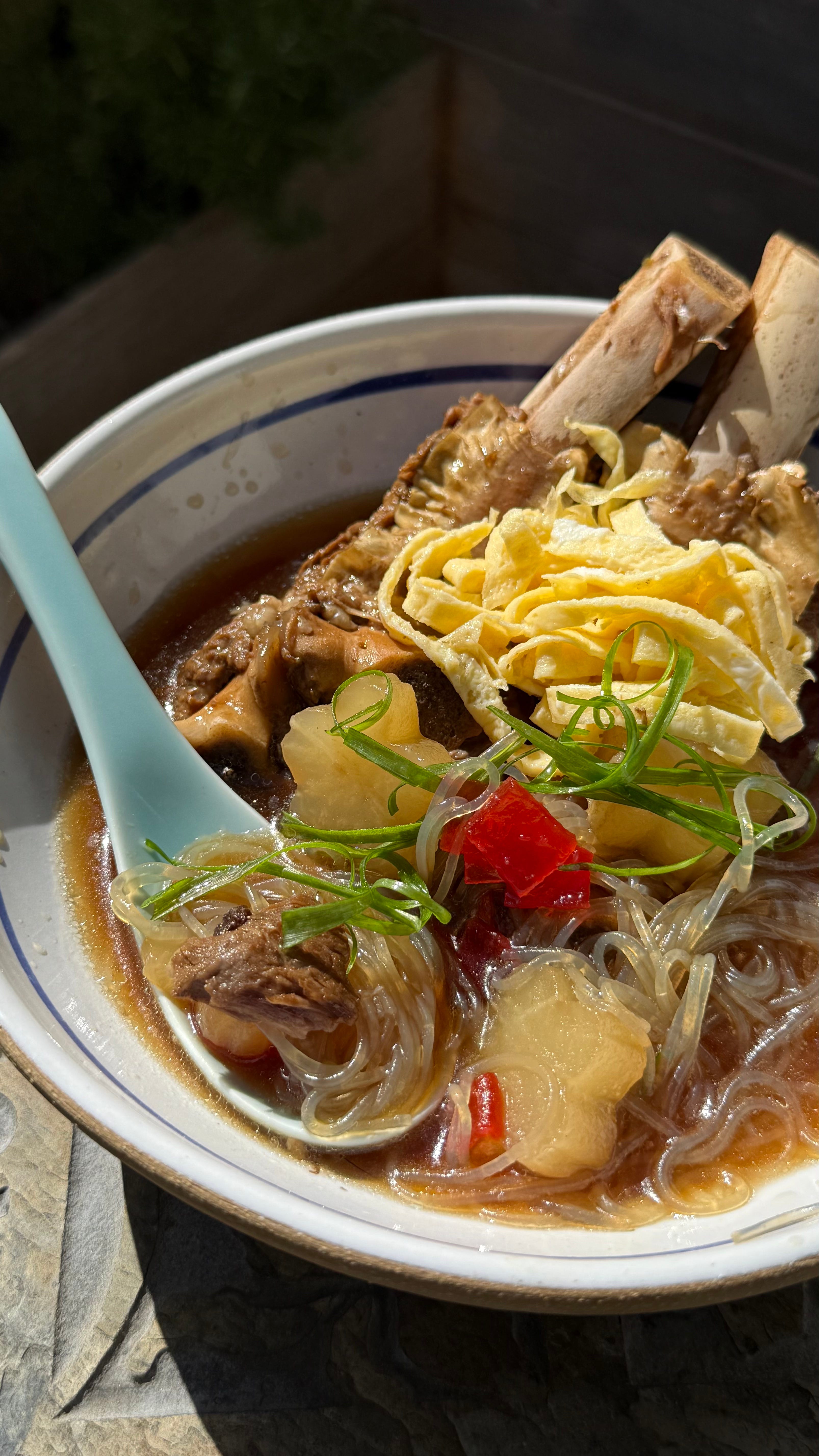 12. To serve, add two ribs to a bowl, the noodles, egg ribbons, kimchi, then ladle the soup on top.