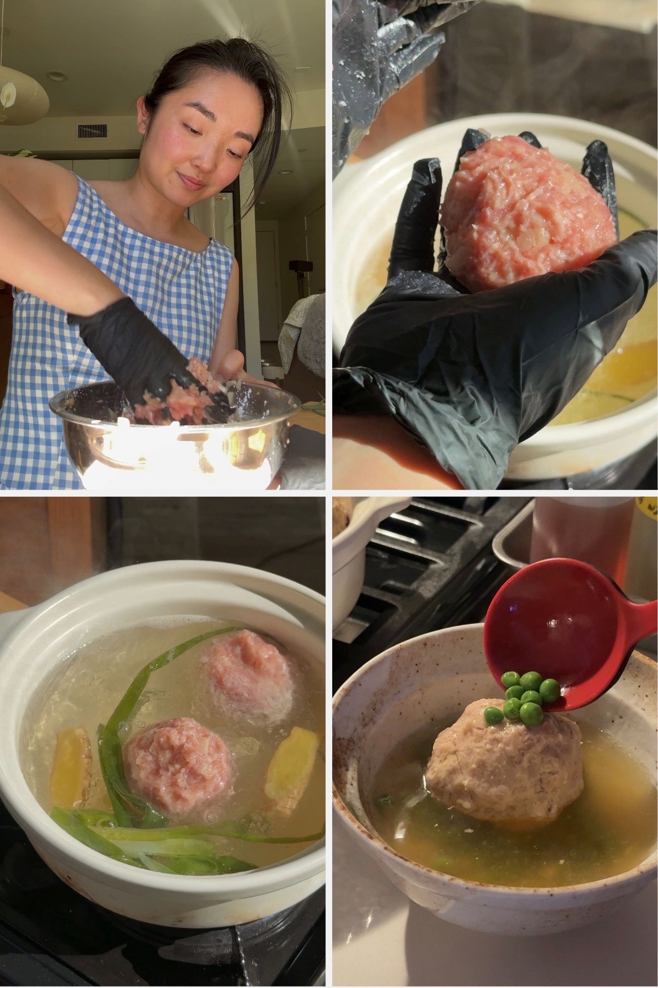 Let the ginger and scallion steep in the water for at least 5 mins to create a ginger scallion tea that will flavor the meatball mixture.