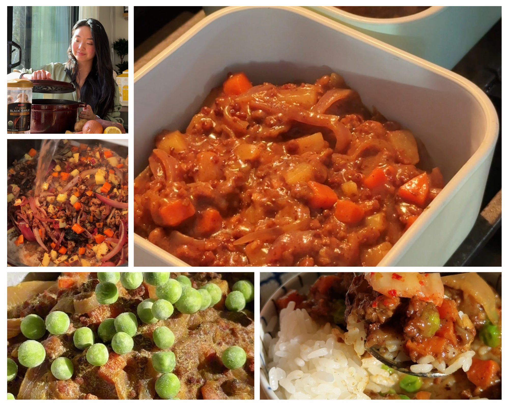 But like most of my post-workout meals, you might have seen a trend that I need to protein + fiber max because of my sensitive tummy. This one is packed with carrots, sweet potato (instead of regular potato), and peas! The root veggies get pre-cooked with the ground beef and curry sauce, but the peas get added the day you’re microwaving.